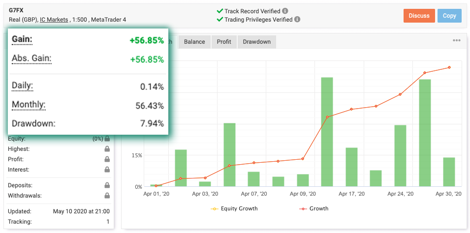 6. Minimum of 10 trading days in any given month. No single day can account for > 20% of monthly profits. Months can be split out but must be within the same MYFXBook user account (any prior losses will be offset).